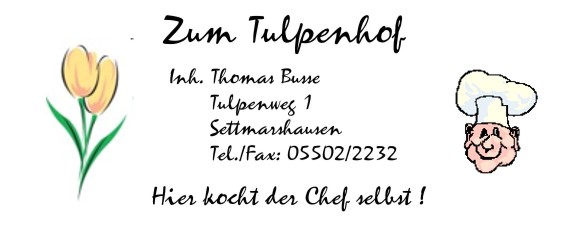 Zum TulpenhofThomas BusseTulpenweg 137124 Rosdorf OT SettmarshausenTelefon: 05502-2232Telefax: 05502-2232